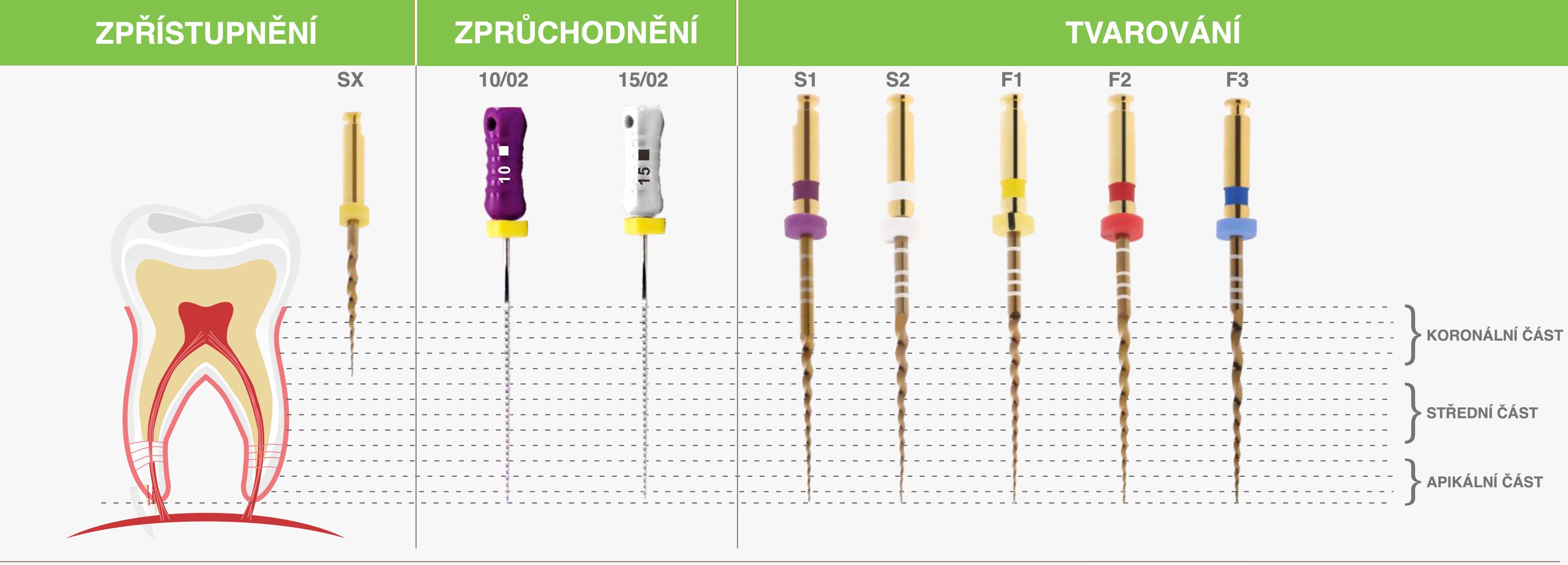 Systém pracuje s variabilní konicitou, která umožňuje postupné a kontrolované rozšíření kanálku od koronální části až po apex. Tento postup podporuje zachování přirozené anatomie kořene, přispívá k efektivnímu odvodu nečistot vznikajících během preparace a vytváří optimální prostor pro následné plnění.