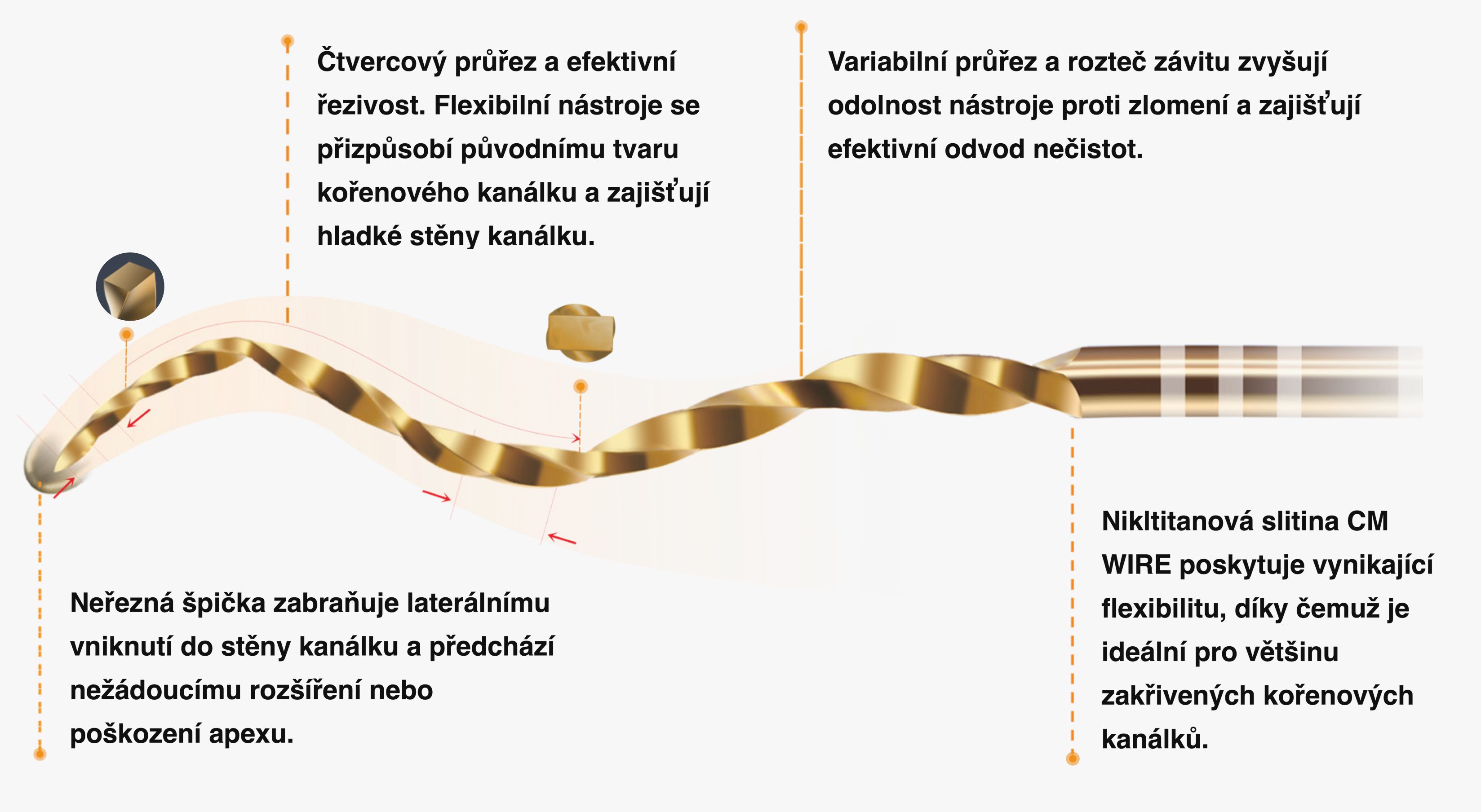 Nástroje jsou navrženy tak, aby se přirozeně přizpůsobily anatomii zubu, sledovaly jeho zakřivení a minimalizovaly riziko vytvoření nežádoucích defektů. Bezpečná neřežná špička zabraňuje perforacím a usnadňuje kontrolované vedení nástroje v celém průběhu kanálku.